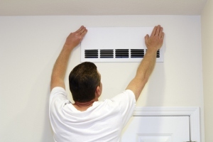 Male placing a paper cover over part of an air return intake vent to increase air return in another vent in the home.